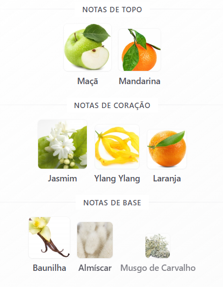 • Principais acordes: frutado, floral branco, baunilhado, adocicado, almiscarado