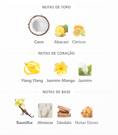 Principais acordes: Coco, lactônico, doce, tropical, floral branco, almiscarado