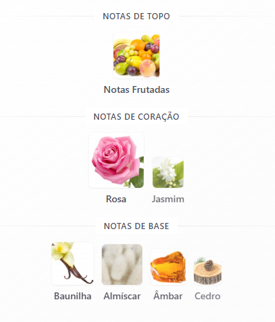 Frutado na saída, rosado no coração e quente no fundo, ele combina rosa cremosa com âmbar sedutor e baunilha envolvente.