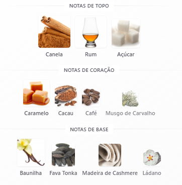 Doce, gourmand, baunilha, café, alcoólico, especiado, amadeirado, balsâmico