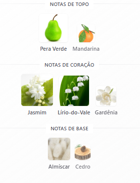 No coração, o jasmim e a gardênia aparecem cremosos, mas nunca pesados. O lírio-do-vale traz aquele toque de “perfume de mulher elegante e arrumada”.
